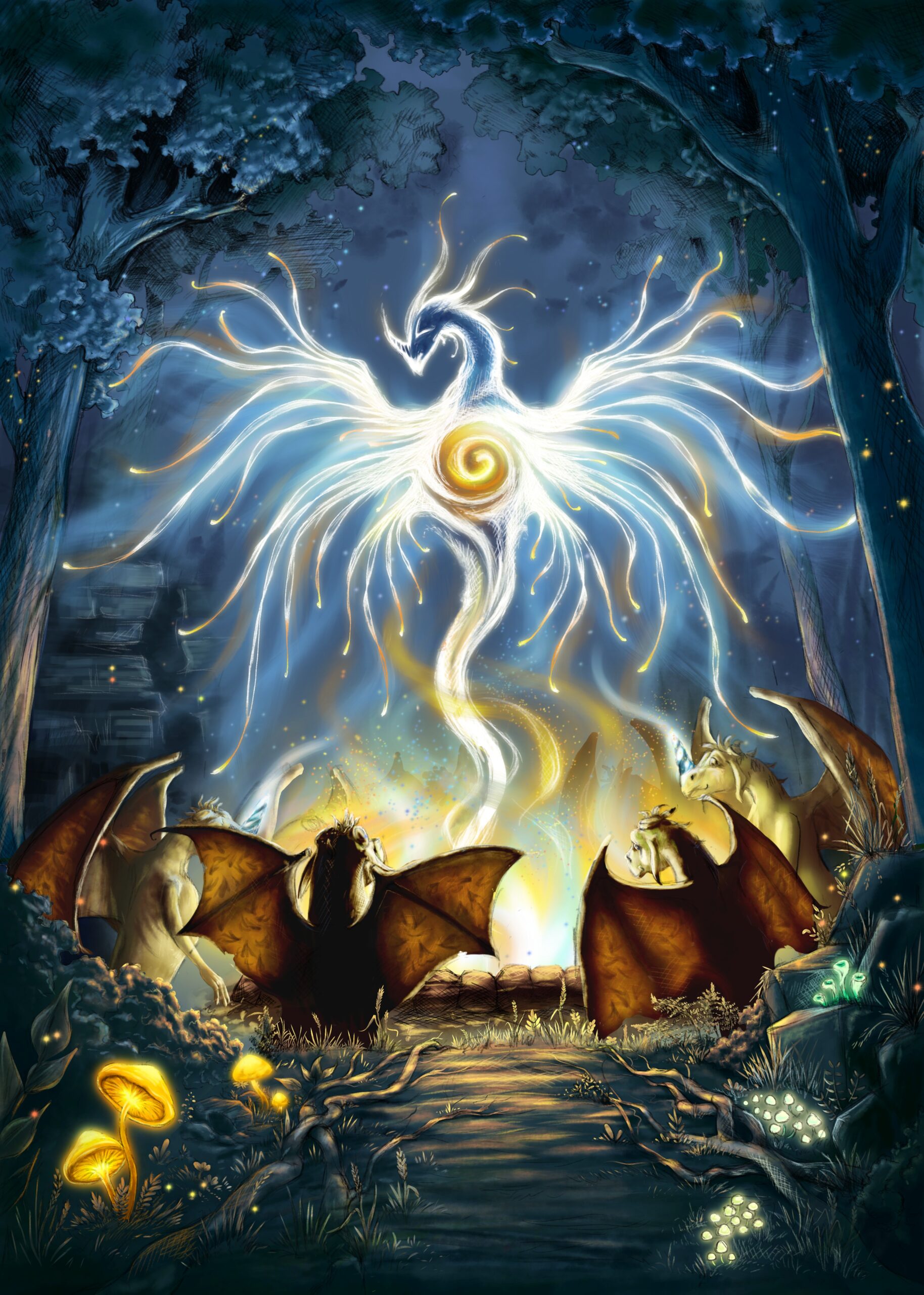 Je to pramatka všech beskydských dračic. Není to obyčejná dračice — její tělo tvoří zářící magické částice a stužky, které svítí jako hvězdy na noční obloze.